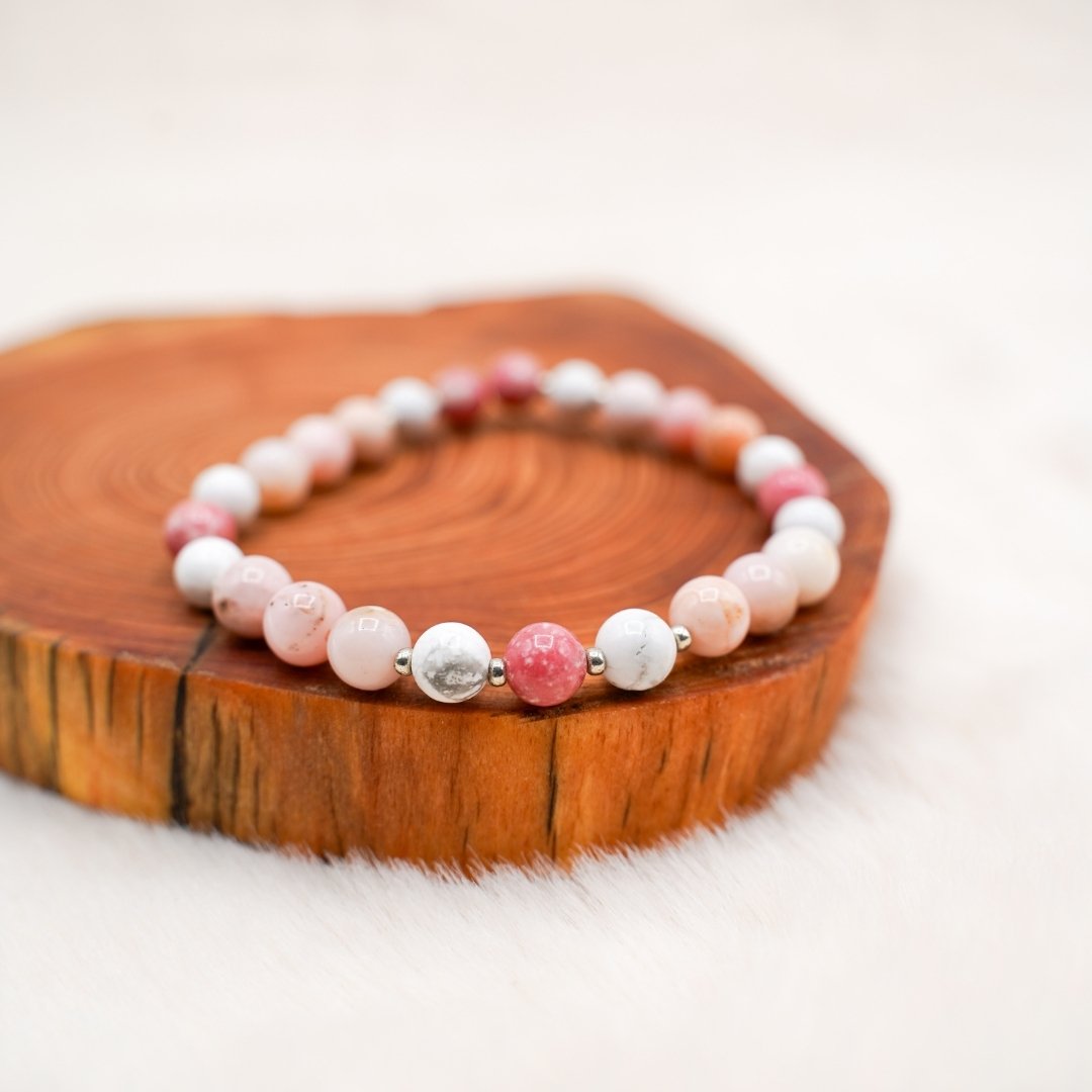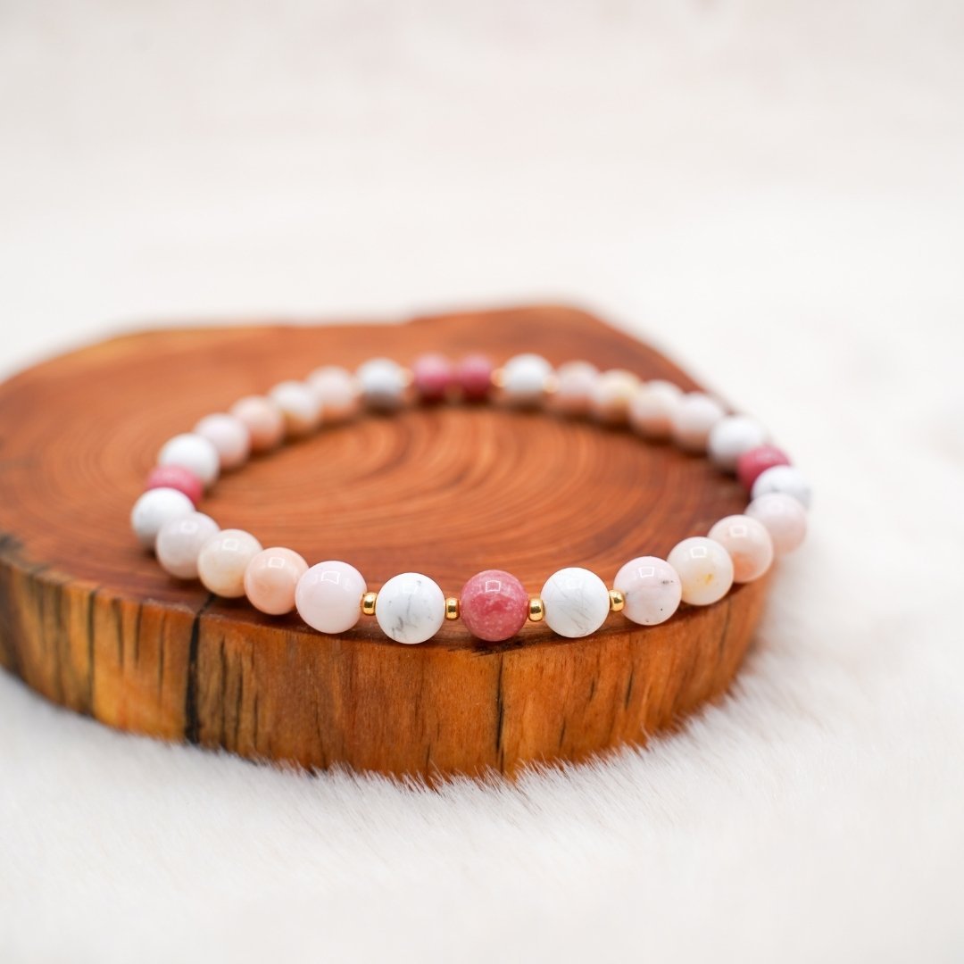 Le bracelet “Aime-toi” est une douce invitation à cultiver l’amour et l’estime de soi au quotidien. Composé de howlite blanche, d’opale rose et de thulite, il est conçu pour nous rappeler que l’Amour inconditionnel est une force créatrice puissante. Porter ce bracelet, c’est choisir de nourrir la paix intérieure et de s’accueillir avec bienveillance, peu importe les défis de la vie.
