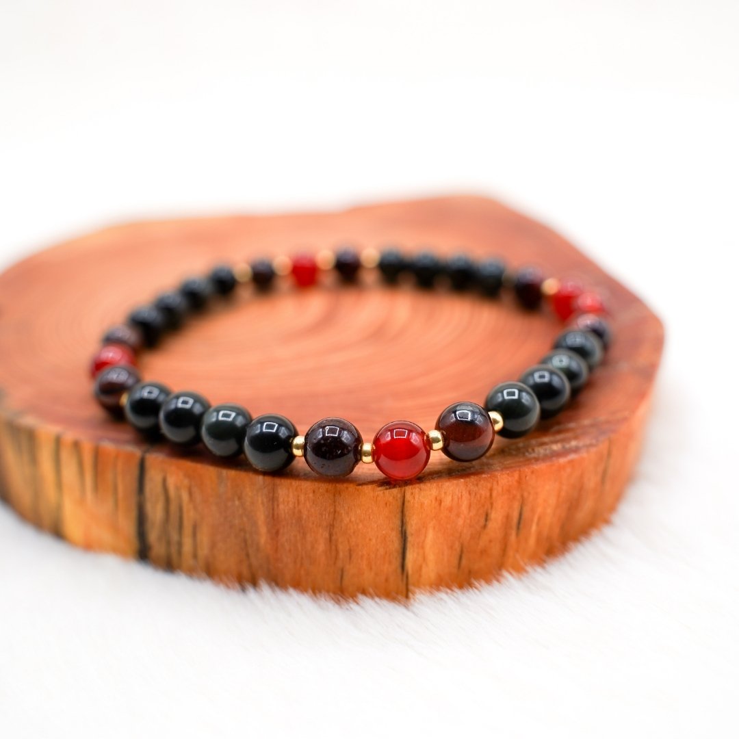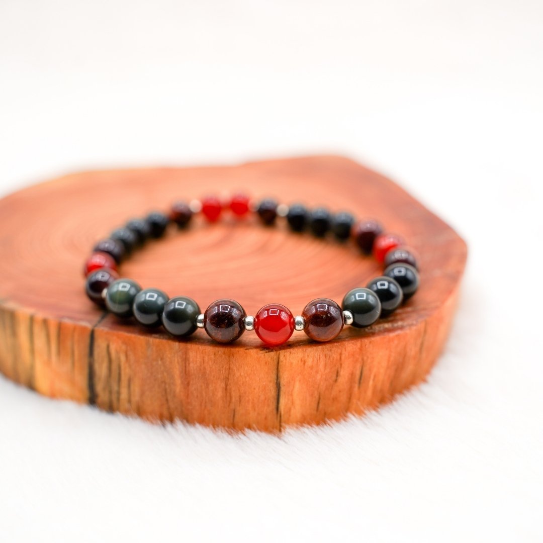 Le bracelet “Ancrage” est notre allié pour renforcer nos racines et stabiliser nos énergies. Avec l’œil de taureau, la cornaline et l’obsidienne, il nous propose un retour à la Terre et à la matière. Il nous aide à puiser la force nécessaire pour nous ancrer fermement, et ainsi faire descendre le subtil de nos inspirations divines dans la matière.
