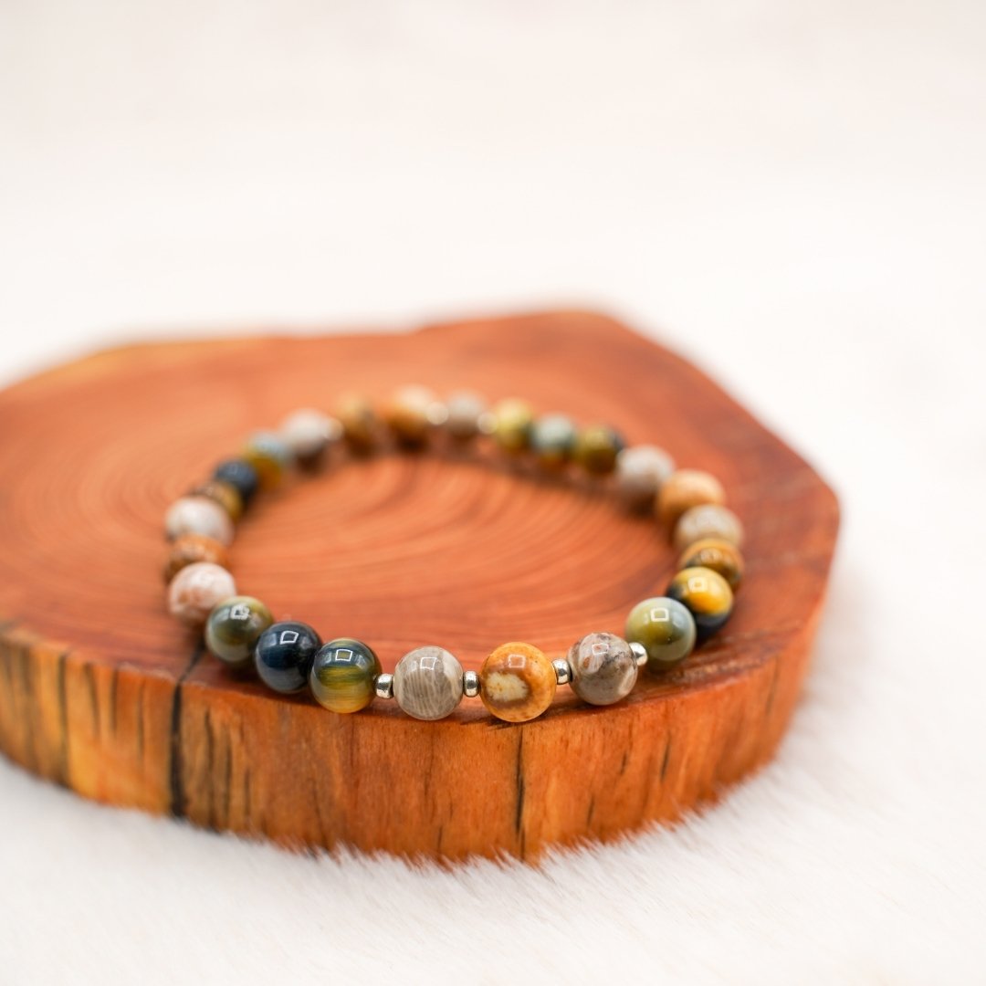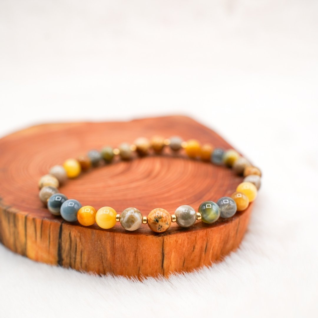 Inspiré par le dieu hindou Ganesh, à tête d’éléphant, le bracelet “Ganesha” nous aide à surmonter les obstacles avec élan et confiance. Composé de jaspe fossile, de jaspe paysage et d’œil de tigre jaune/bleu, ce bracelet est un talisman de chance et de réussite. Portez-le pour renforcer votre détermination et inviter la prospérité dans votre vie.