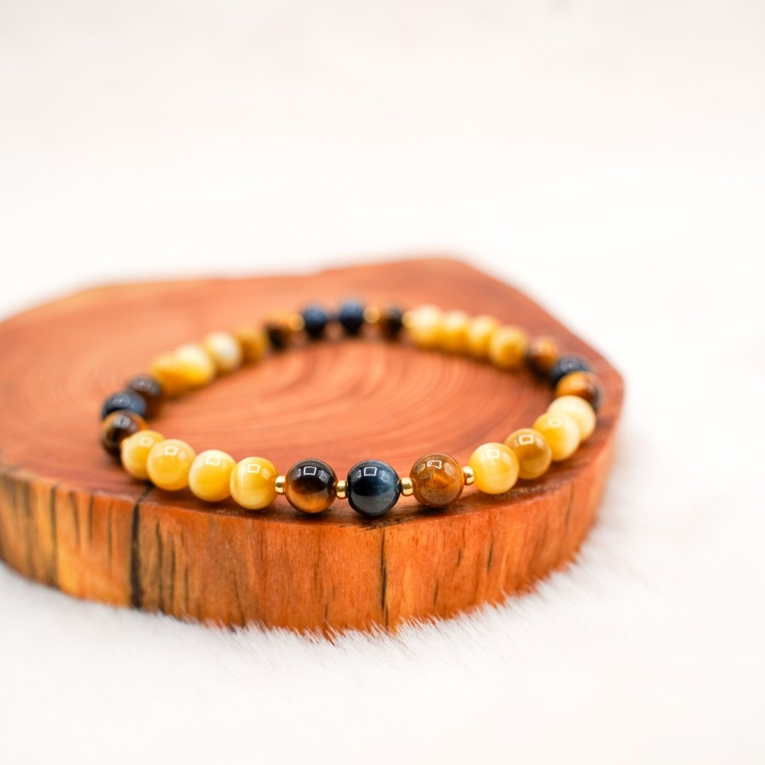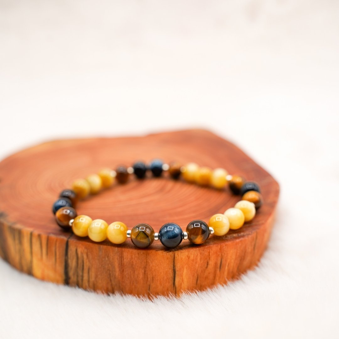 Le bracelet “Oser Être Soi” nous invite à développer notre confiance en nous et l’affirmation de notre identité profonde. Composé d’œil de faucon, d’œil de tigre et d’œil de tigre doré, des pierres à l’énergie solaire très puissante, il nous aide à rayonner par notre Présence, sans être influencé par les énergies extérieures.