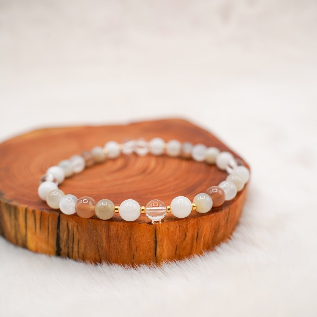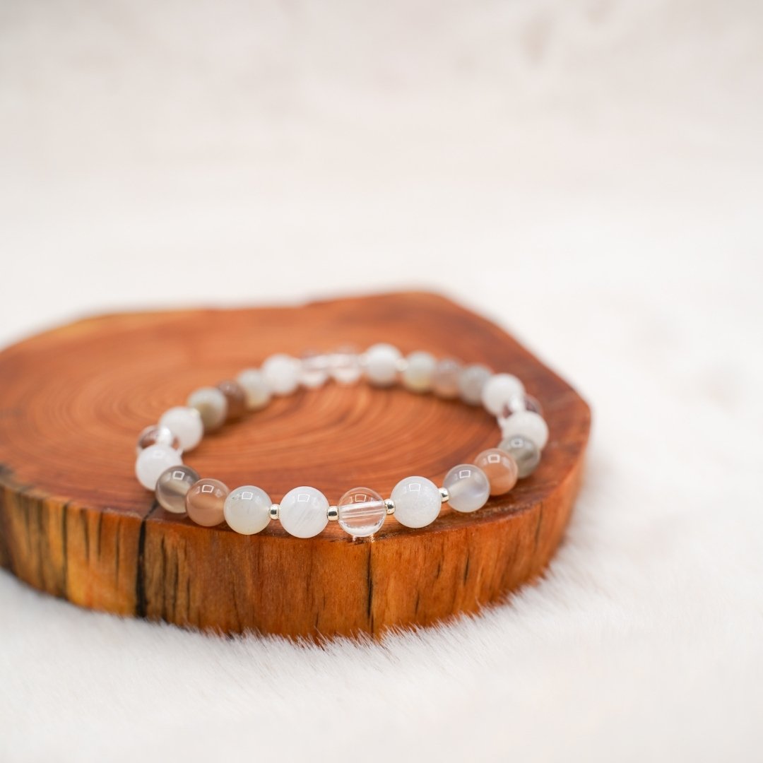 Pierres semi-précieuses (6mm) : cristal de roche, pierre de lune multicolore, pierre de lune blanche.