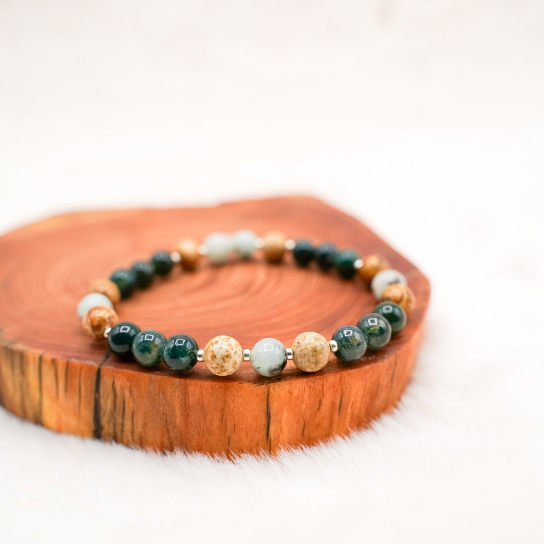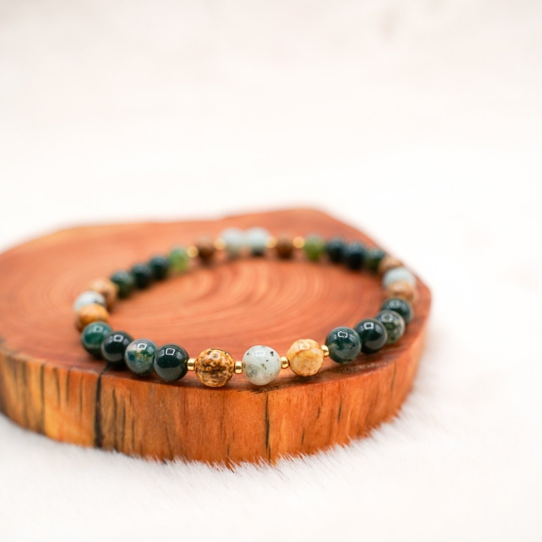 Pierres semi-précieuses (6mm) : agate mousse verte, jaspe kiwi, jaspe paysage.