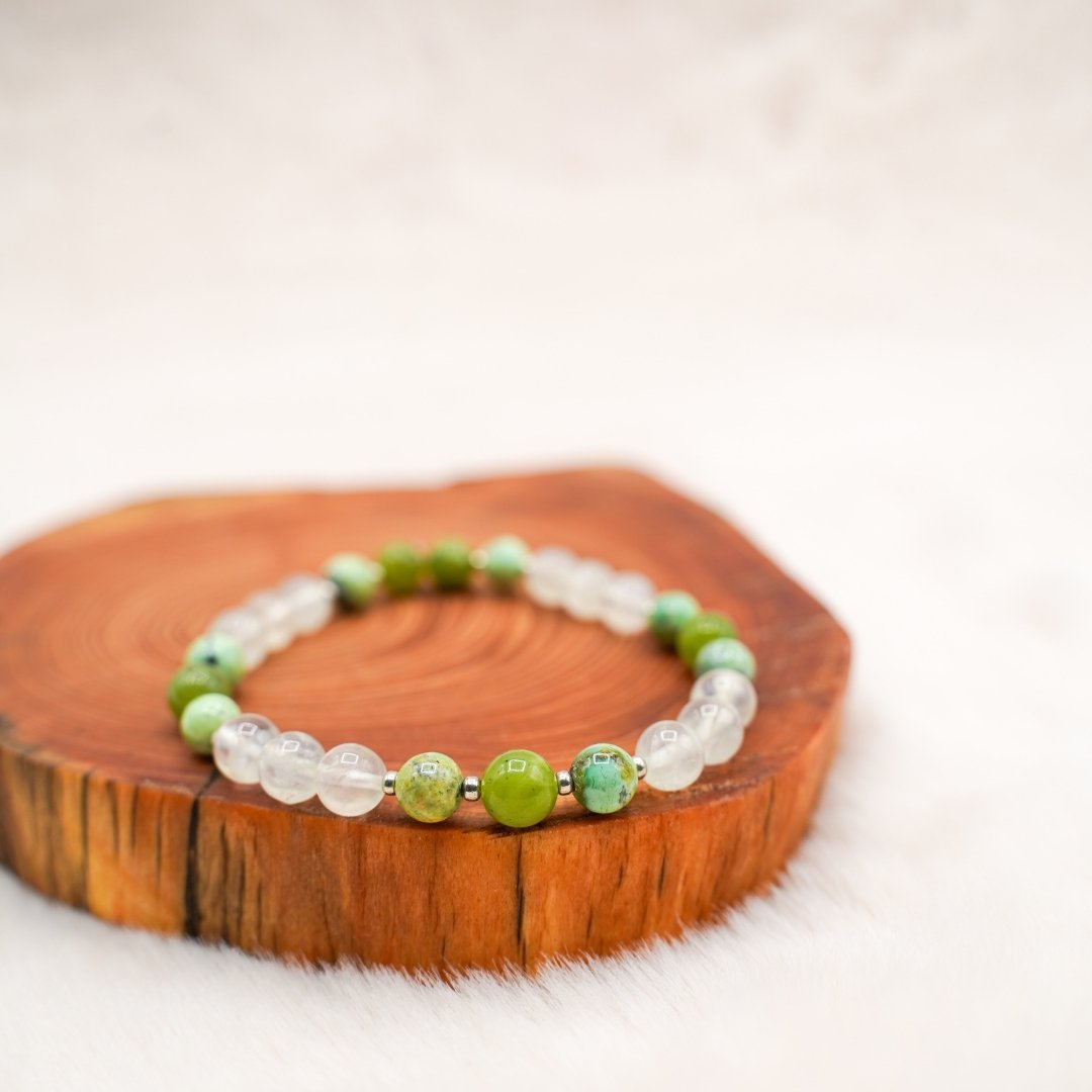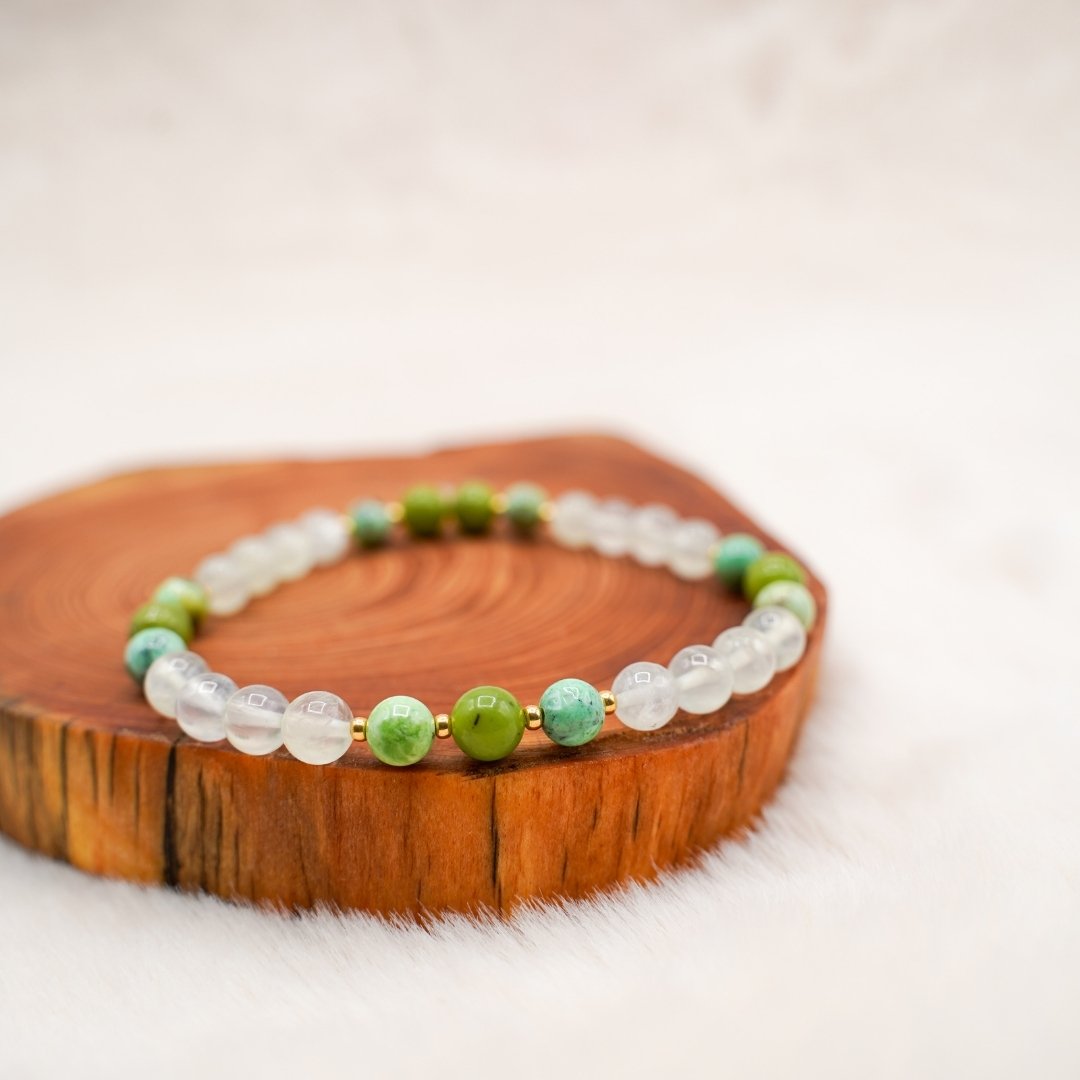 Le bracelet “Pachamama” facilite la connexion entre les quatre règnes terrestres : minéral, végétal, animal et humain. Il est composé de quartz rutile vert, de jade néphrite et de variscite. D’inspiration Amazonienne, il nous relie à la sagesse de la Terre à travers la porte de notre cœur. Son intention profonde est de nous soutenir dans toutes nos missions de pont entre les mondes.